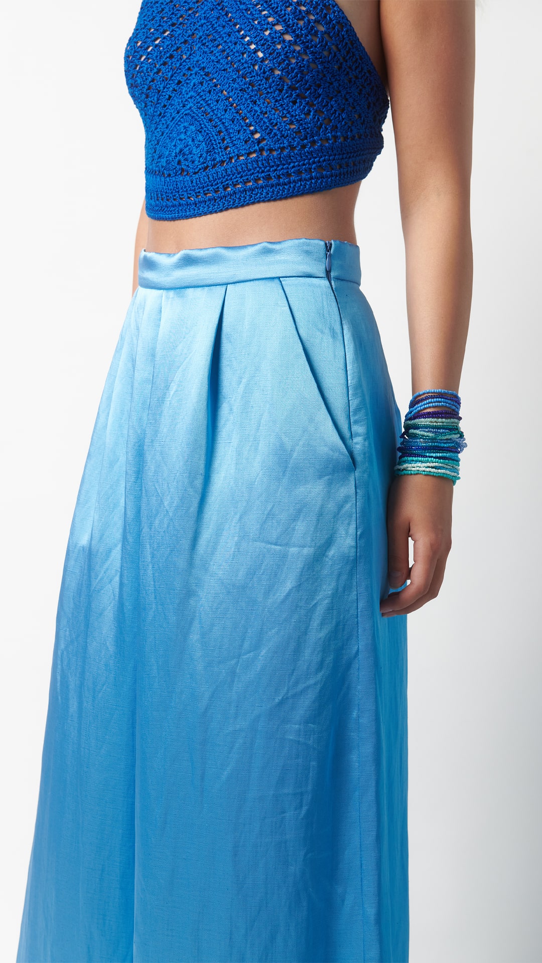 Il pantalone palazzo Coralie unisce il rigore della sartoria italiana alla leggerezza evocativa dei paesaggi esotici.